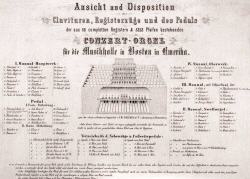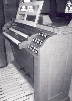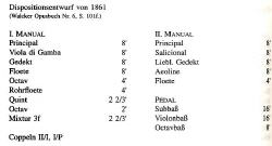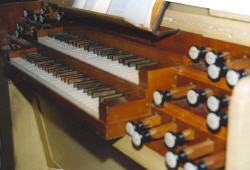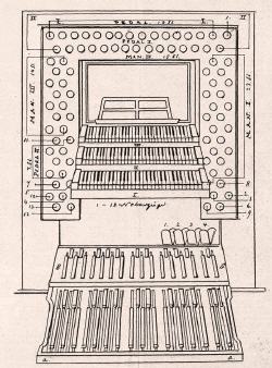 Crescendo- Decrescendo von Physharmonika III.Man Schweller für II. und II.Pedal (es wurde ein Piano-Pedal eingerichtet. Spieltisch war nicht mit Doppelpedal ausgestattet. Dafür ein Kollektivzug, der schnelles Umregistrieren von Piano auf Normalpedal gestattete. Crescendo-Walze war mechanisch- pneumatisch. 6 verschiedene Kollektivzüge für verschiedene Piano und Forte Stufen Es wurden Elfenbein für die Untertasten und Ebenholz für die Obertasten verwendet. Pedalklav. in Ahorn, Beläge in Ebenholz. Wichtig ist noch zu erwähnen, dass Eberhard Friedrich mit seinen Söhnen umfangreiche Experimente an dieser Orgel mit elektrischer Traktur erprobten, die aber ohne Erfolg waren und nicht realisiert wurden. |