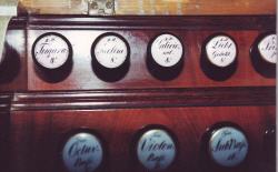 Die kleinen Manubrien links und rechts der 4 Manuale waren die Registerzüge; die großen Knäufe bei den Klaviaturbacken waren Kollektivzüge, und die Großknäufe in der untersten Reihe waren Kollektivzüge. Die beiden Segment -Tafeln links und rechts des Notenpultes waren Crescendo-zeiger.