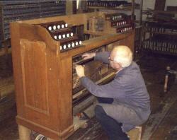 Rund 1/3 der Orgel in Schramberg wurden erneuert, ebenso der Spieltisch, der wie man sieht weitgehend nach originalen Gesichtspunkten gefertigt wurde. |