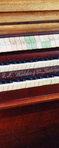Die Orgel wurde mit mech. Kegelladen und Barkerhebeln gebaut. An dieser Orgeln wurden inzwischen permanent umgebaut, so dass vielleicht noch 40% der Pfeifenwerks von Walcker ist. Absolut nichts mehr ist von den Windladen und der mechanischen Traktur erhalten. Klanglich ist heute kaum noch Walcker oder Skinner herauszuhören. Bei unserer Betrachtung ist nur der historische Ansatz beachteswert. Der unten gezeigte Spieltisch ist der dritte oder vierte us-amerikanische, der dort eingebaut wurde. |