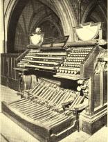 Das Besondere an diesem Spieltisch ist natürlich, dass man bei rund 110 Registern nur 3 Manuale zur Verfügung hat. Es kam ein IV.Manual dazu, auf dem sämtliche Zungenstimmen zu spielen waren!! Unbeschadet davon konnten die Zungen natürlich in ihren zugehörigen Manualen gespielt werden. Prof. Dr. H. Riemann schreibt, dass durch die pneum. Vorrichtung (Barker) eine sehr leichte Spielart war, vergleichbar einer 10reg. Orgel. Die Orgel wurde 1887-88 erstmals umgebaut, wegen Baumaßnahmen am Westturm, der eine andere Aufstellung der Orgel verlangte. Dabei wurden leider schon die 40' großen Prospektpfeifen entfernt.
